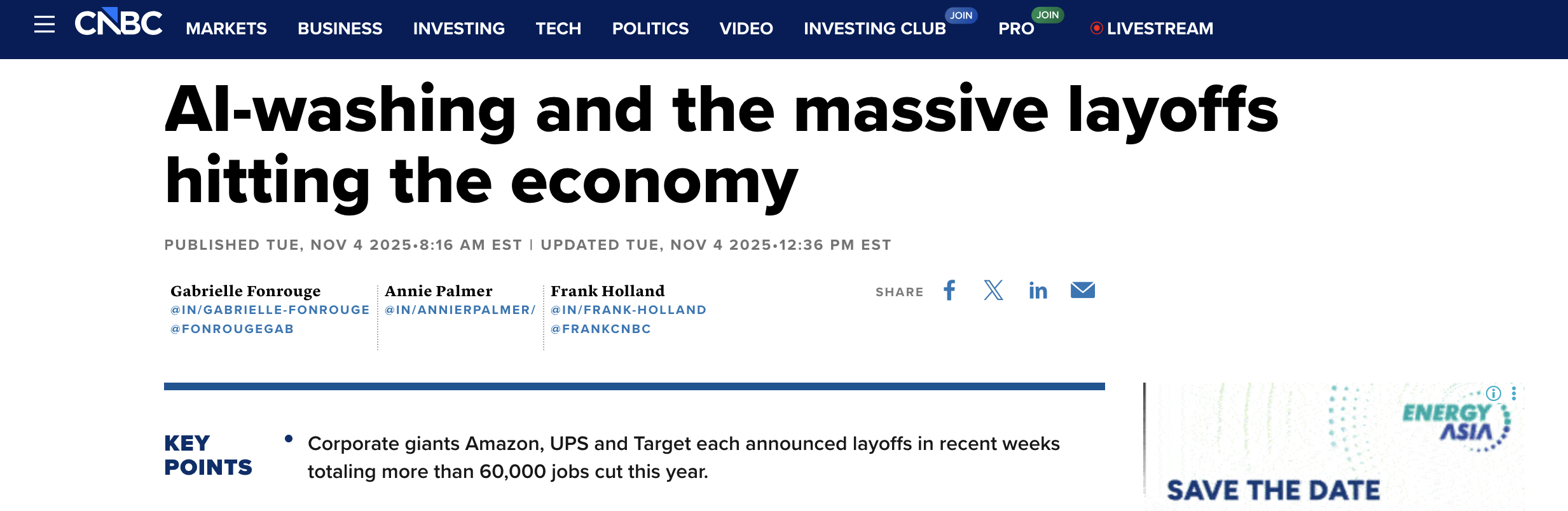 "Des géants de l’entreprise comme Amazon, UPS et Target ont tous annoncé des plans de licenciements ces dernières semaines, représentant plus de 60 000 suppressions de postes depuis le début de l’année.